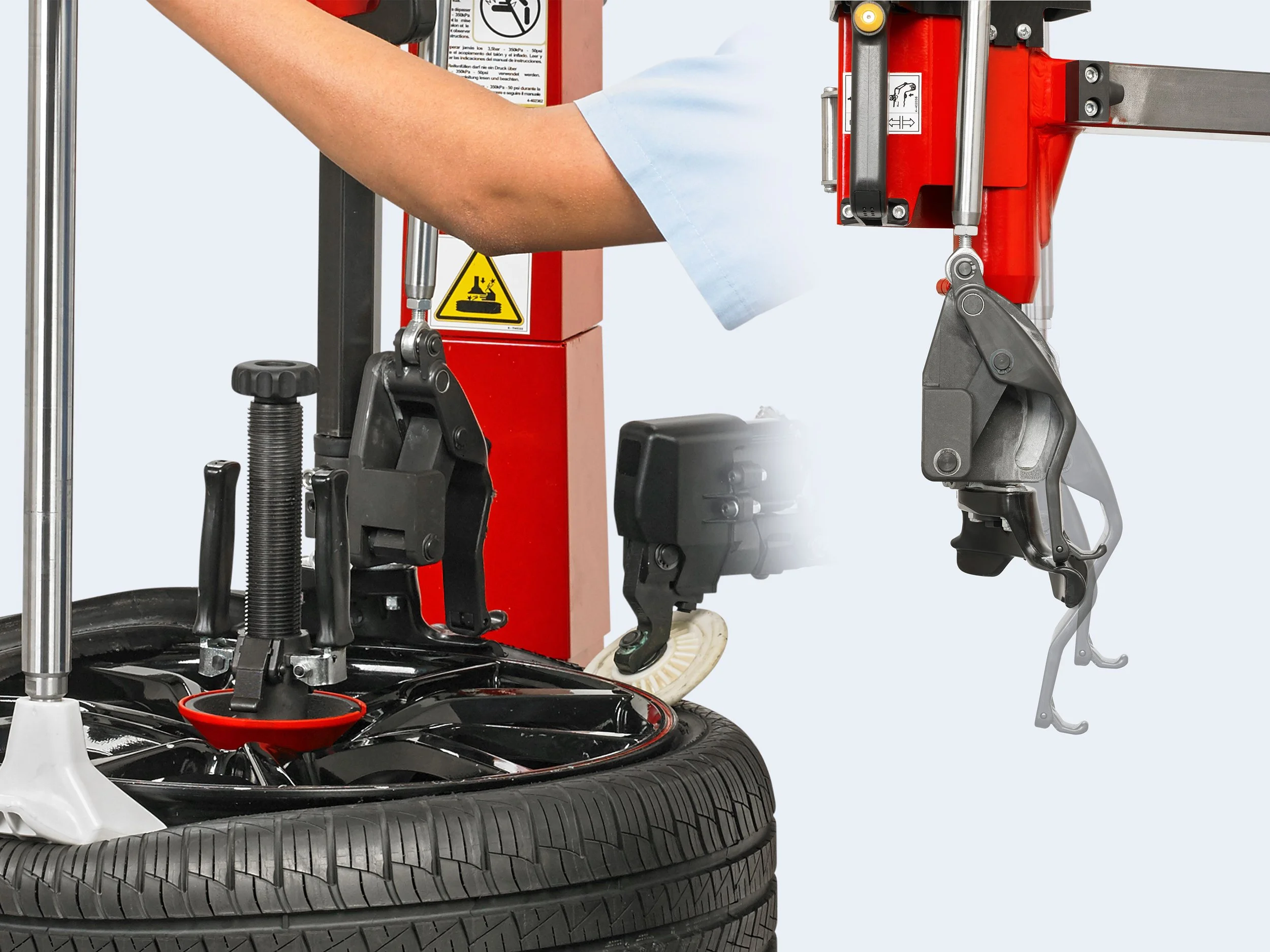 Brazo de Prensa de Talón: Facilita el montaje de neumáticos difíciles y mantiene los flancos en la posición central.