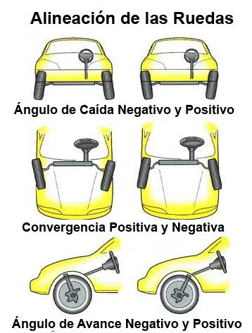 Toe o convergencia: Al ver las ruedas desde la parte superior del vehículo, éstas deben ser paralelas, si ambas apuntan hacia adentro entonces se tiene convergencia; por lo contrario, se tendrá divergencia.